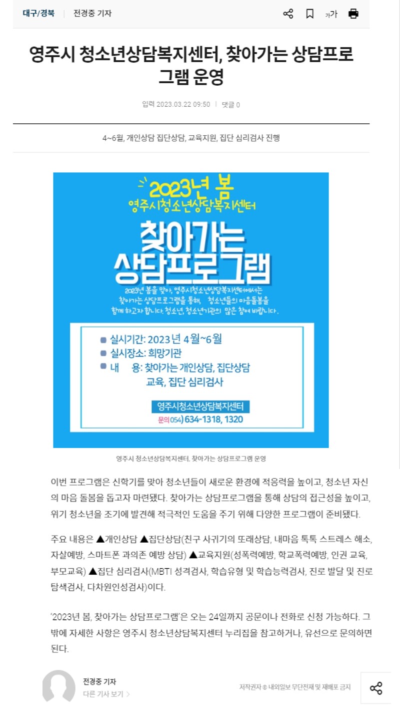 ¿µÁֽà û¼Ò³â»ó´ãº¹Áö¼¾ÅÍ, ã¾Æ°¡´Â »ó´ãÇÁ·Î±×·¥ ¿î¿µ