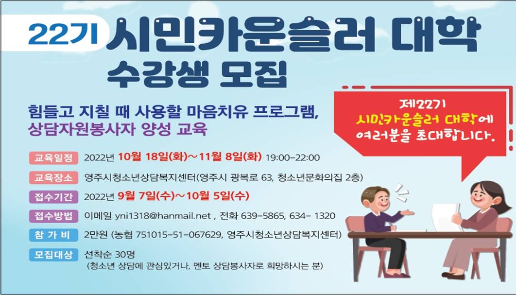 ¿µÁÖ½Ãû¼Ò³â»ó´ãº¹Áö¼¾ÅÍ(¼ÒÀå °¸Å¿µ)´Â 7ÀϺÎÅÍ 10¿ù 5ÀϱîÁö 22±â ½Ã¹Î Ä«¿î½½·¯´ëÇÐ ¼ö°»ýÀ» ¸ðÁýÇÑ´Ù.½Ã¹ÎÄ«¿î½½·¯´ëÇÐÀº